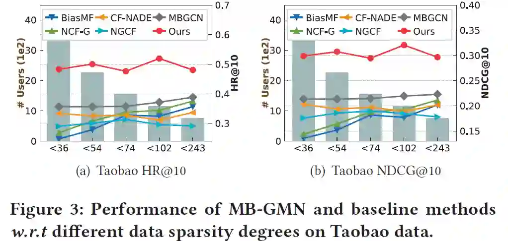 接下来,我们进一步评测 MB-GMN 与部分 baseline 方法在不同稀疏度的数据上表现如何。我们将 Taobao 数据集划分为 5 个子数据集,每个子数据集的交互数相等。下图中柱状图描绘 5 个子数据集的用户数量,折线图则表现各个方法的测试结果,x 轴坐标代表对应子数据集中单个用户的最大交互数,从左到右数据集由稀疏变得稠密。可以看出,MB-GMN 在不同稀疏度上均取得了较好的效果。