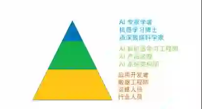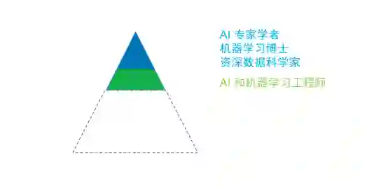 我认为事情的本质是人才结构的问题。这张图是我和蒋总讨论了很久以后我们列出来,其实一个成熟的,在未来5年以后真正赚到很多钱的人工智能企业,它的人才结构应该是这个样子的,应该是AI专家学者,机器学习的博士们,资深专家比较多;然后呢,应该有一大堆AI的机器学习工程师,AI的产品经理、架构师在这里。更重要的底下有大批的开发者,数据工程师,运维人员,行业人员,这是一个合理的结构。