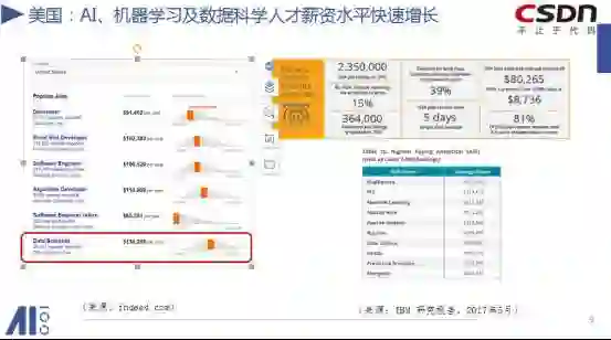在美国,AI、机器人,机器学习与数据科学人才薪资水平目前快速增长中。你如果是程序员,你的薪资平均水平是九万一千美金,不过图中代表众数(mode)的那根柱子靠左,说明更多的人是略低于这个水平的。这说明少数的超高薪的程序员把多数低工资的程序员给平均了。而算法工程师,尤其是数据科学家,他们整体收入水平很高,均值十三万美元,而且图中代表众数的那个柱字偏右,说明超过这个收入的人群在他们整个这个人群当中也是多数。在招聘网站上,把 AI 方面人才的广告挂出去,5天时间招不到人,显著高于其他职业。意味着什么?供不应求。这个是美国的情况。