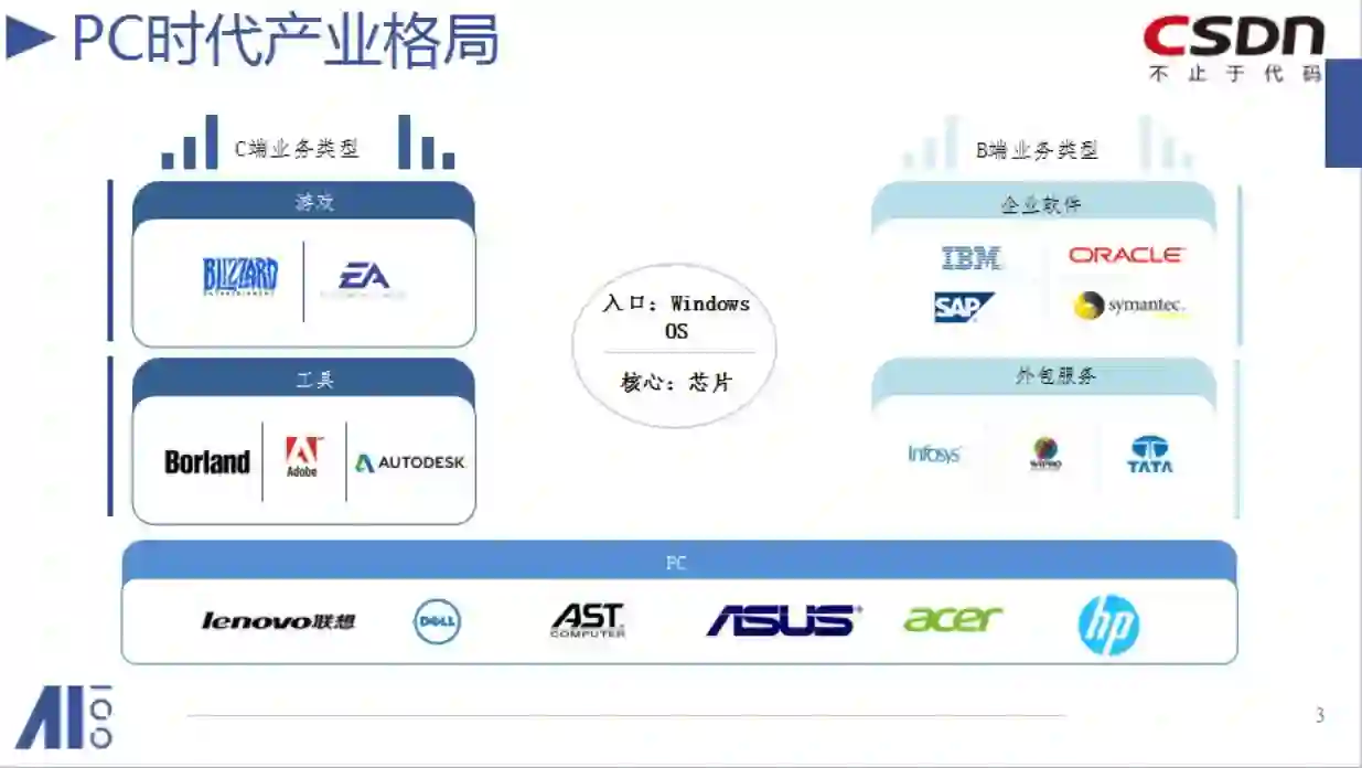 因为这是PC时代,PC时代最核心的是入口就是操作系统,或者是Windows的桌面,它是建立在X86因特尔的芯片技术上。围绕着这个,我们才有了PC时代,也诞生了开发者的时代。