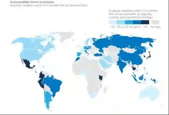 中国会怎样呢?大家看这幅图,也来自麦肯锡,在世界地图上蓝色越深的地方,当前劳动力当中可以被机器和人工智能取代的比例越高。墨西哥、玻利维亚、秘鲁这些国家,它整个自动化程度很低,所以有大量的手工工作都是可以被机器所取代的,他们是深蓝色。然后呢,像美国、加拿大、澳洲这样的国家,他们的自动化程度很高,所以他能够被机器所取代的工作的比例并不是特别高,所以是浅色的。