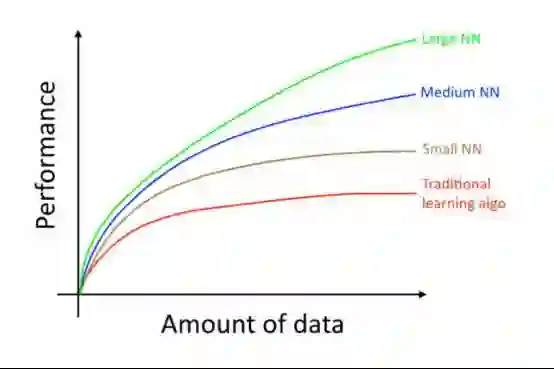 我们来看,这张图是吴恩达在一本书叫 Machine Learning Yearn的书里面一幅著名的插图,纵坐标是算法的表现,横坐标数据量。从这个图中你可以看到,对于大规模的神经网络来说,数据量越大,它的性能就会越高,也可以说它的能力越强。我问过在这方面非常顶尖的专家,目前有没有看到顶点?他告诉我说,他们有人已经做到上万层的深度神经网络,还是没有看到这个顶点在哪里。深度学习它的红利是很厚的,目前还远远没有吃完。这是第一点。