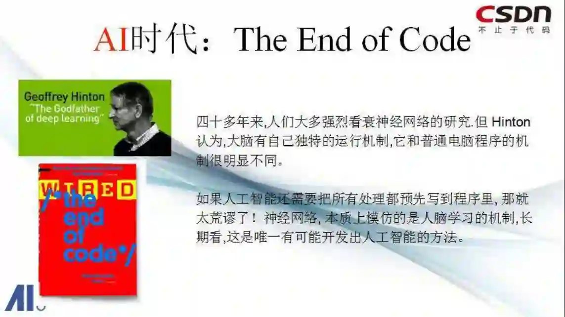 我们常说代码时代结束了,其实它指的不是所有代码,而是原来我们是用各种各样的规则和技术,现在可以用深度学习,用神经网络来建立模型,用以取代原来人工设立的规则。