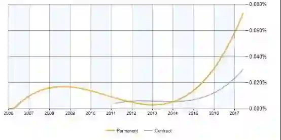 英国是全球人工智能的另一个中心。从2014年开始,英国的AI人才需求迅速的直线的上升,就是需求量迅速的上扬。