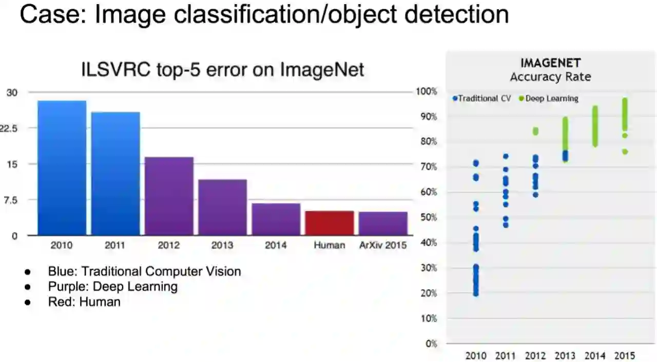在2012年Imagenet比赛中,深度学习的使用,将识别错误率大大降低,引起了人们的关注。也就是说,原来人工智能技术被一道墙堵住了,过不去,进步很小,但是采用深度学习后,这个墙相当于被凿开了一个窟窿。下图中紫色代表采用深度学习,蓝色代表传统方式,可以看出其中的跨越式的变化。