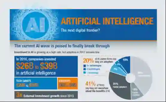这个是来自麦肯锡的一个报告,2013年到2016年里面,AI这个领域获得的外部投资增加了3倍,2016年的总规模达到了260亿到390亿美金之多。投资的效应是累积的,这些投资将会对 AI 的发展产生很大的拉动。