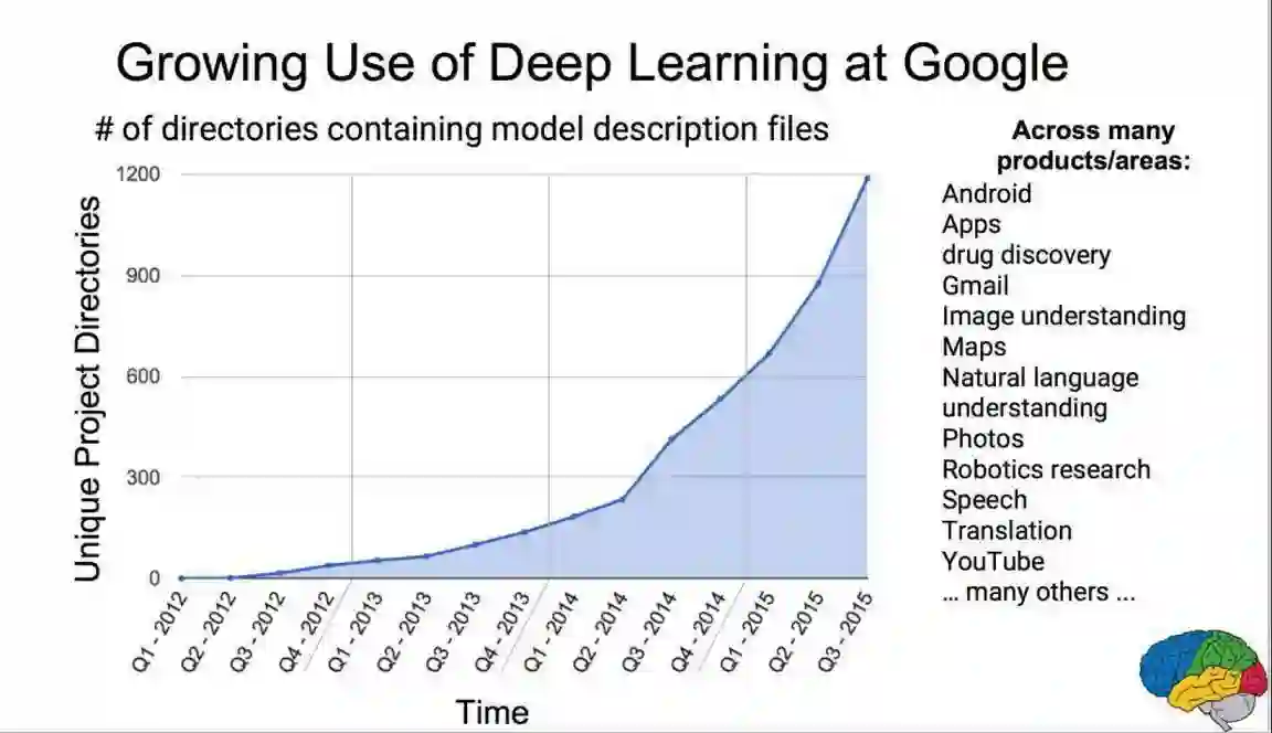 从2012年开始,他们就开始用,一开始几个项目,到2015年Q3已经有1200个项目使用深度学习。到2016年,已经有2700个。目前Google内部的所有项目,80%以上都用到了深度学习来改进。