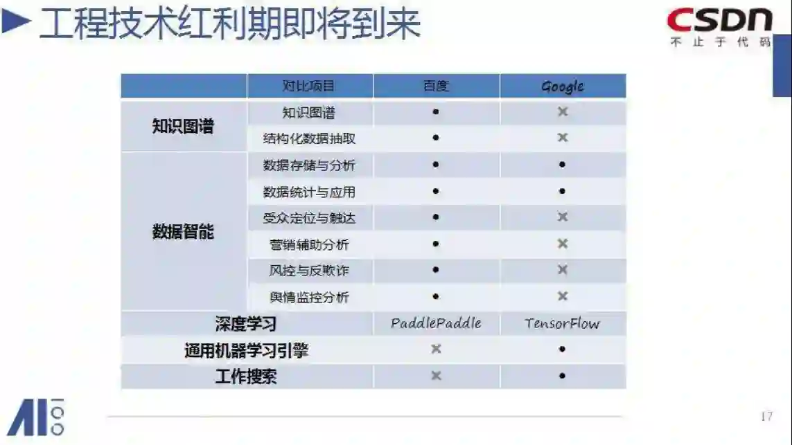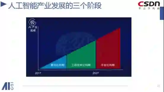 但是算法红利期还有个两三年可能就要结束了。这不是说算法不会有进步了,还是会有很大的进步,但是呢,从算法的突破,到工具化,这个转化路径现在变得很顺畅,两三年之后会更顺畅。如果你有一个算法突破,发表论文出来,很短的时间内,几个月,甚至几周内,Github 上会有实现出来,甚至你可能会看到百度、谷歌把新的算法放在自己的开放API里面,这就意味着,企业竞争主要拼的就是工程能力和产品能力了。到那个时候,整个 AI 产业里的薪资水平会有更合理的分布。