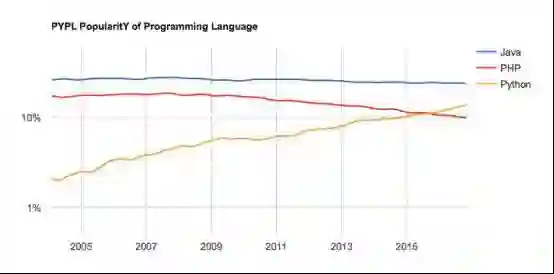这是从2005年到2016年,这三个语言薪资水平之间的一个对比,排在上面的是遥遥领先的是Java,它在整个企业应用,电子商务开发的地位,很难被撼动,目前它的薪资是排名第一的。排名第二名的是世界上最好的语言,PHP,这个语言跟Java一直是并驾齐驱,保持不是很大的一个差距,但是到2014年,15年之后,出现了一个死亡交叉,Python语言在收入上开始超过PHP,我相信Python开发者的薪资水平超过是Java是迟早的事情,在最近两三年之内就会发生。