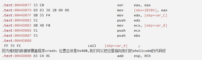 由于返回地址被覆盖,所以我们需要修复堆栈,让程序可以找到自己的返回位置,那么程序就不会crash了,在shellcode代码运行完成后,我们加入以下平衡堆栈的代码,就不会crash了