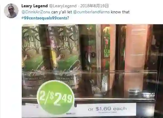 眼看着中间商赚了这么多差价,亚利桑那冰茶自然不会坐视不管,他们发起了 # 99cents equals 99cents (99 美分等于 99 美分)活动,走群众路线,号召广大消费者不要为商店里的“高价”买单,积极在线上举报坐地抬价行为: