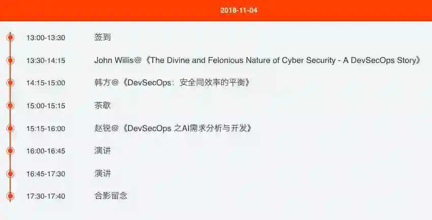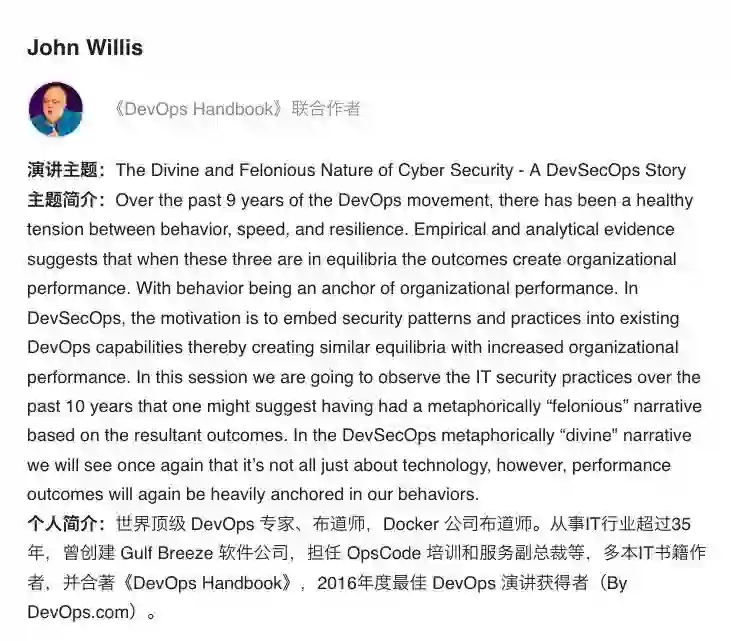 11月4日,没错~11月4日 深圳,DevSecOps Days 首度来华,全球 DevOps 领军人物、布道师,Docker 公司布道师 John Willis 将作为主咖亲自为你分享 The Divine and Felonious of Cyber Security - A DevSecOps Story 的精彩议题,敬请期待!