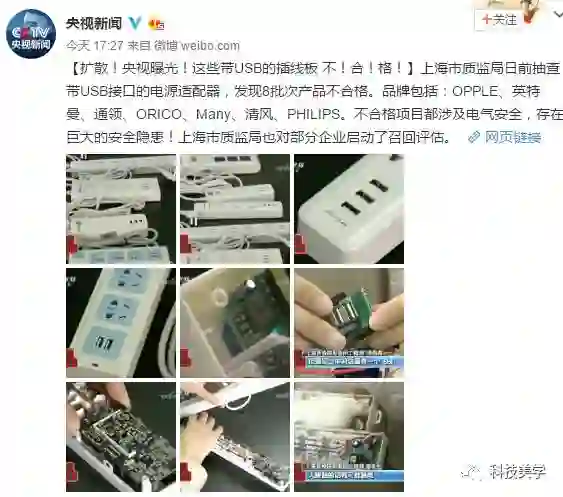 【扩散!央视曝光!这些带USB的插线板 不!合!格!】上海市质监局日前抽查带USB接口的电源适配器,发现8批次产品不合格。品牌包括:OPPLE、英特曼、通领、ORICO、Many、清风、PHILIPS。不合格项目都涉及电气安全,存在巨大的安全隐患!上海市质监局也对部分企业启动了召回评估。