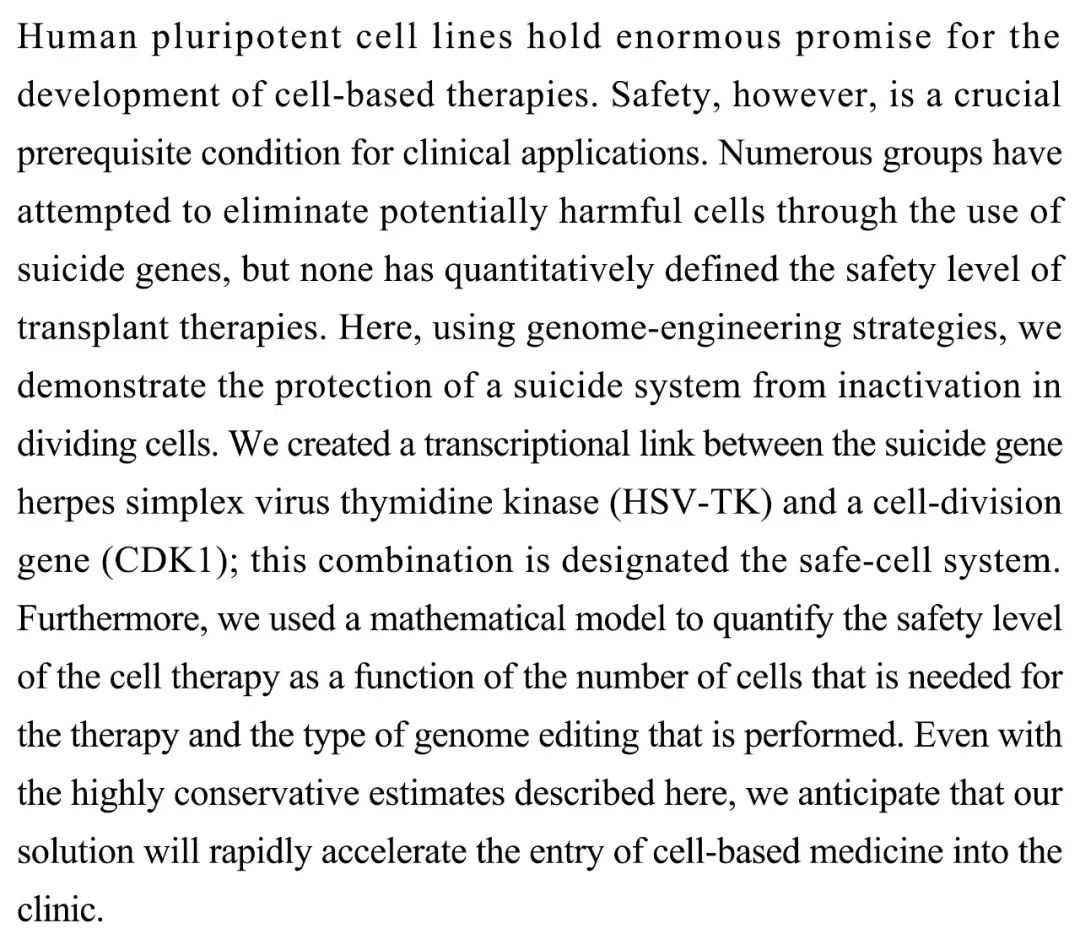 (导读王思菲)利用自杀基因来去除临床细胞治疗中的有害细胞,是个能提升安全性的方案,但未有相关报道量化细胞治疗的安全性水平。本研究应用基因组工程策略证明自杀系统在分裂细胞中能持续运作。研究人员创造单纯疱疹病毒胸苷激酶(HSV-TK)和细胞分裂基因(CDK1)的转录链接,并使用数学模型量化细胞治疗的安全水平,设计治疗所需细胞数量及基因组编辑类型的函数。上述结果将加速细胞治疗在临床上应用。