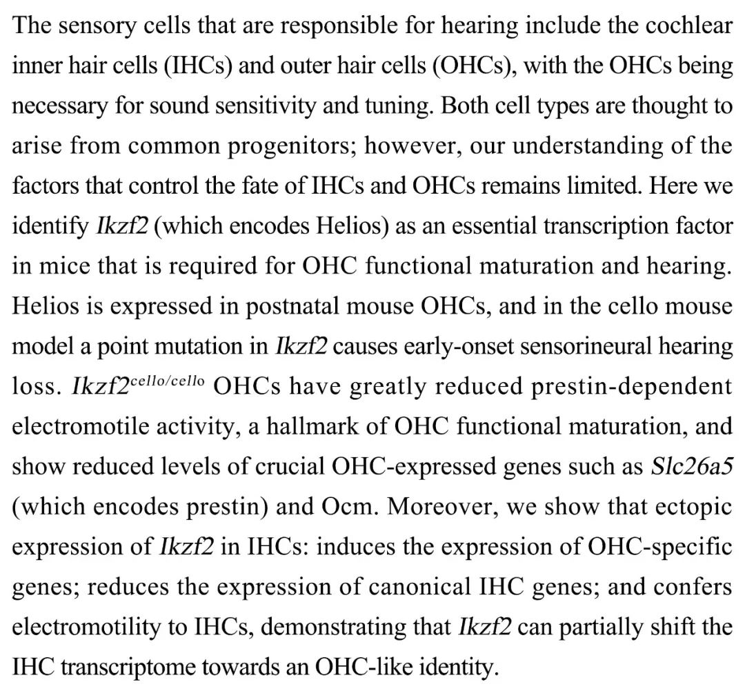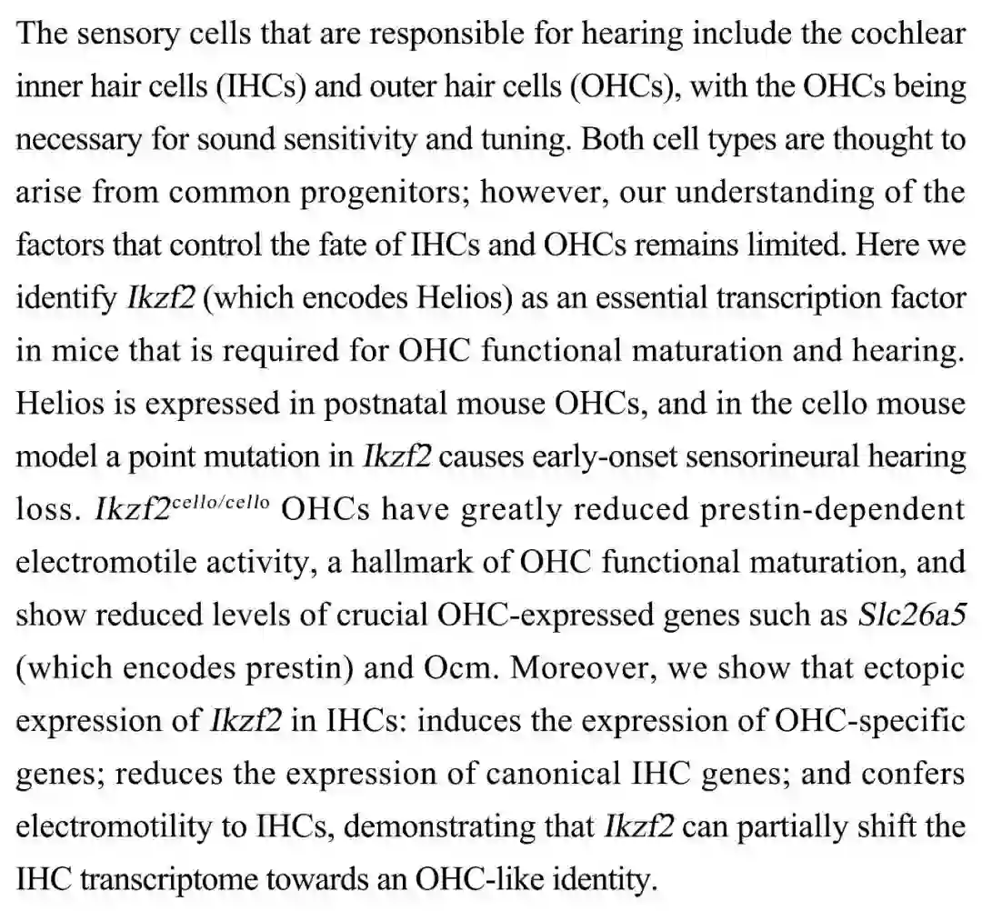 (导读 郑维嘉)负责听力的感觉细胞由耳蜗内毛细胞和外毛细胞组成,二者由共同祖细胞分化的调控机制尚不清楚。本研究发现突变小鼠cello模型中编码Helios转录因子的Ikzf2导致早发感觉性听力丧失,prestin依赖的电动活性降低,OHC相关重要基因表达降低。在IHC中外源表达Ikzf2可诱导OHC特异基因表达,降低IHC经典基因表达,使IHC具有电动活性。该研究证明Ikzf2可完成IHC转录组向OHC样转录组的部分转换。
