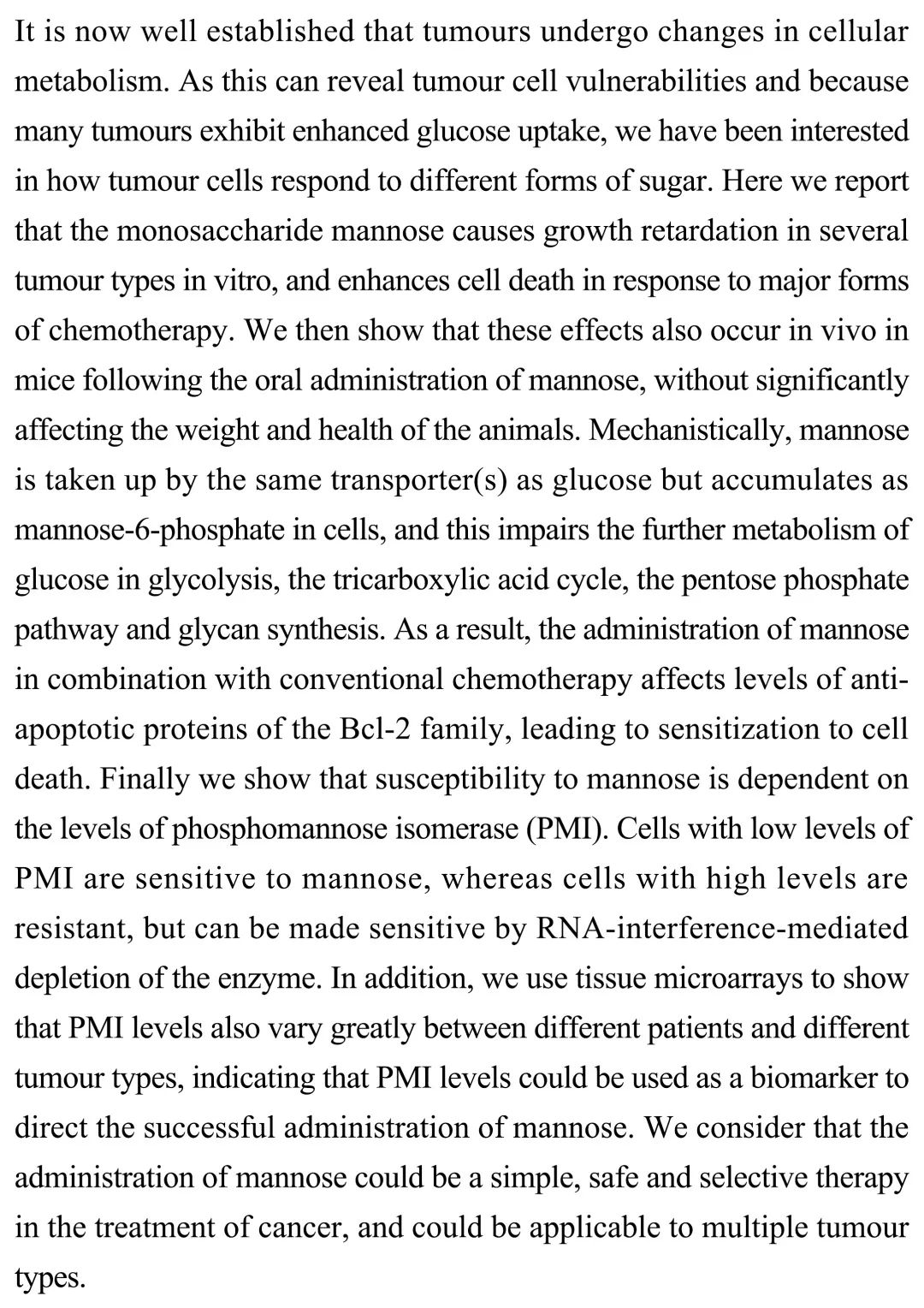 (导读王思菲)甘露糖被与葡萄糖相同的转运蛋白摄入,但无法进行糖酵解、三羧酸循环及聚糖合成等糖代谢。本研究发现甘露糖延缓几种肿瘤生长,和常规化疗合并使用,影响Bcl-2家族的抗凋亡蛋白水平,进而促进肿瘤细胞死亡。肿瘤细胞对甘露糖的敏感性取决于磷酸甘露糖异构酶(PMI)的水平,可通过RNA干扰降低PMI水平使肿瘤细胞对甘露糖敏感,因此肿瘤的PMI水平可作为是否适用甘露糖疗法的生物标志物。