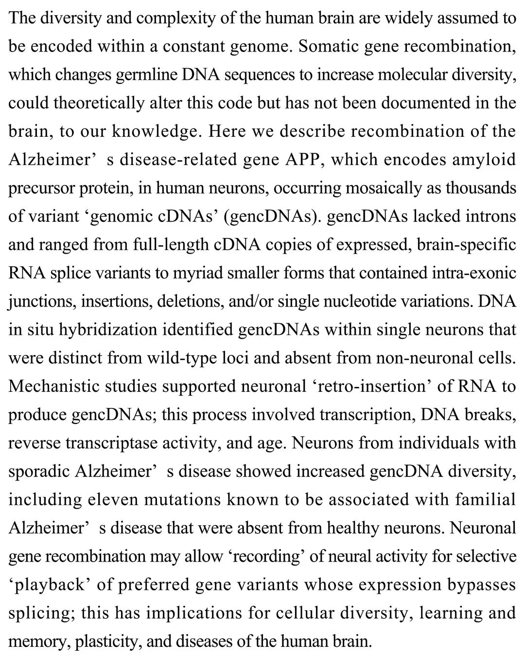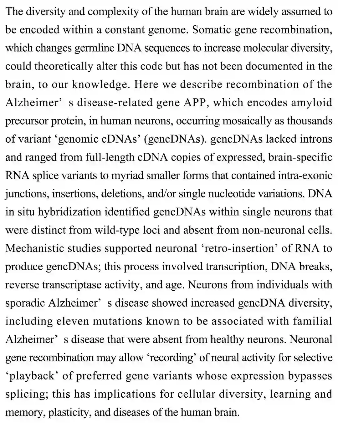 (导读阿金)人类大脑的多样性和复杂性被认为编码在一恒定基因组内,而体细胞基因重组理论上能够改变这种编码。本研究描述了人类神经元内可编码淀粉样前体蛋白、与阿尔茨海默病相关的APP基因重组现象,以上千种基因组cDNAs(gencDNAs)变异体出现。同时确认RNA的神经元“逆向插入”产生gencDNAs,鉴定了gencDNAs的多样性。该结果为理解人类大脑细胞多样性、学习和记忆机制、以及可塑性提供新见解。