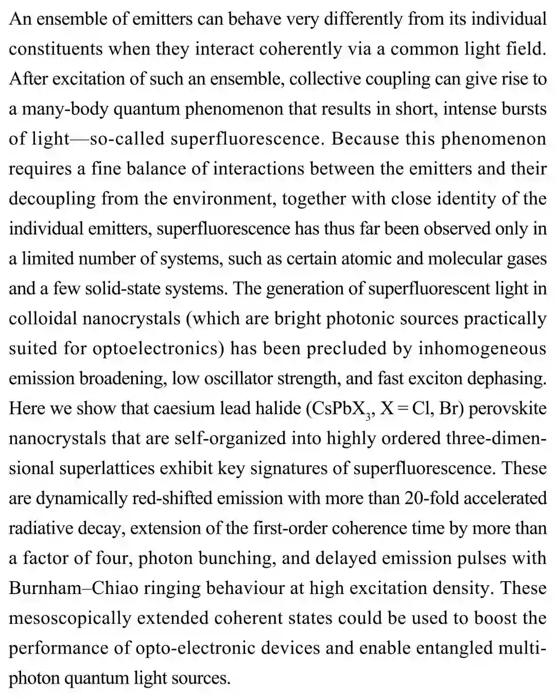 (导读 王嘉媛)超荧光现象形成条件苛刻,迄今为止仅在有限数量的系统中可以观察到。本研究报告了在铯铅卤化物钙钛矿纳米晶自组装成的三维超晶格中,可以实现相干超荧光耦合,表现出超荧光。其拓展介观相干态可提高光电器件的性能,并使实现多光子量子纠缠光源成为可能。