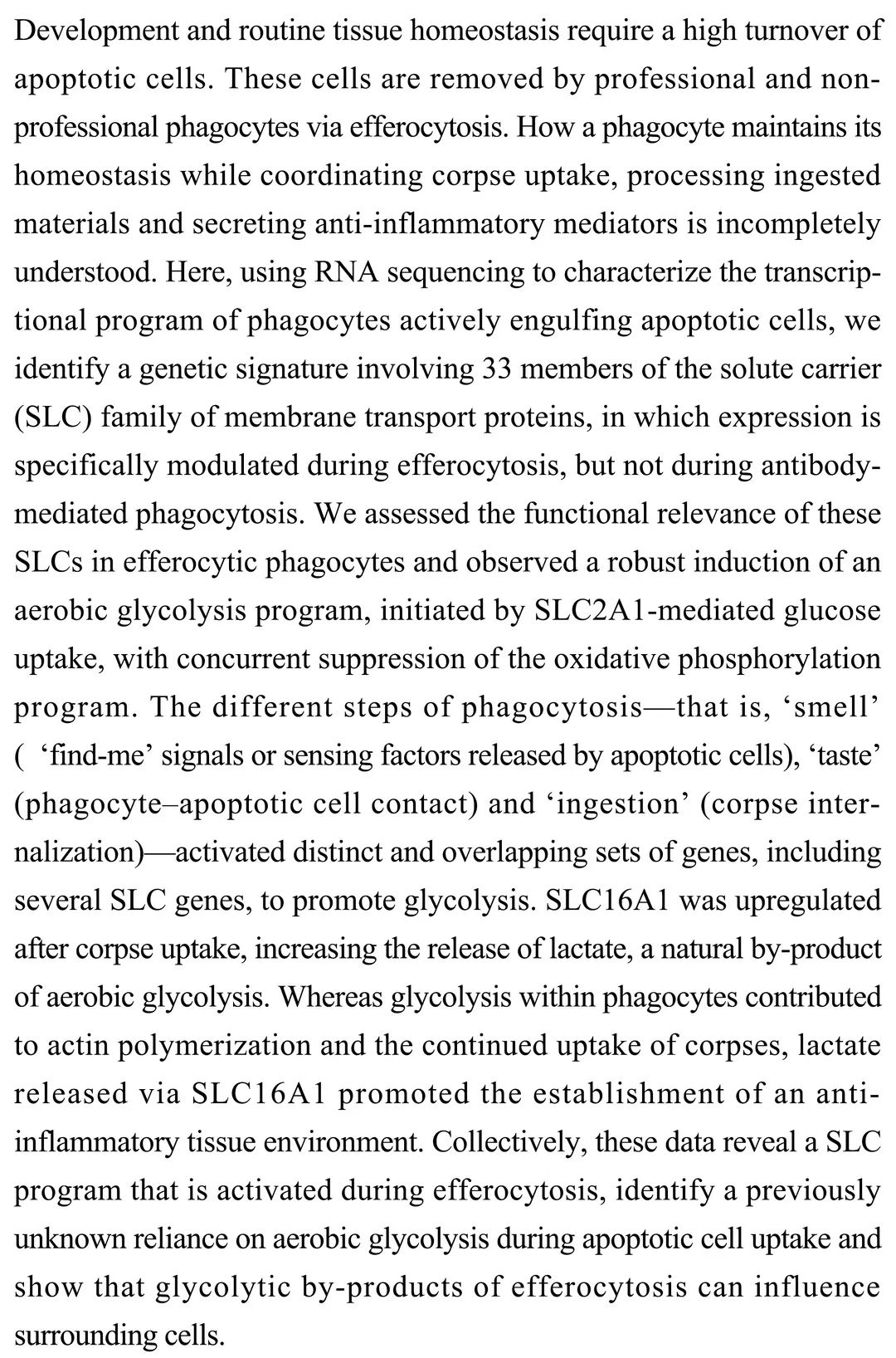 (导读王思菲)吞噬细胞如何协调凋亡细胞的尸体吞噬(胞葬作用,efferocytosis)仍有诸多未知。本研究使用RNA测序描述了胞葬作用的转录程序,发现溶质载体蛋白(SLC)家族中有33个基因的表达在胞葬作用中被特异性调节。其中SLC2A1介导葡萄糖摄取并促进糖酵解,从而促进肌动蛋白聚合及摄取细胞尸体;而SLC16A1介导的乳酸释放促进组织中抗炎环境的形成。以上结果揭示了胞葬作用与有氧糖酵解以及糖酵解副产物的关系,并凸显了SLC程序在其中的重要性。