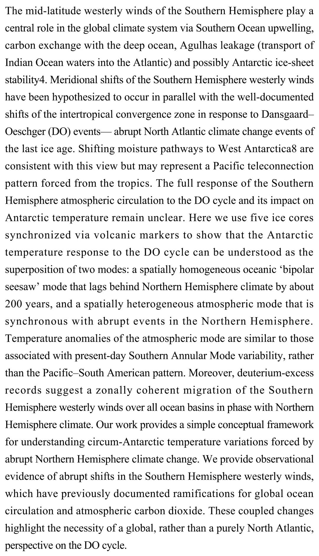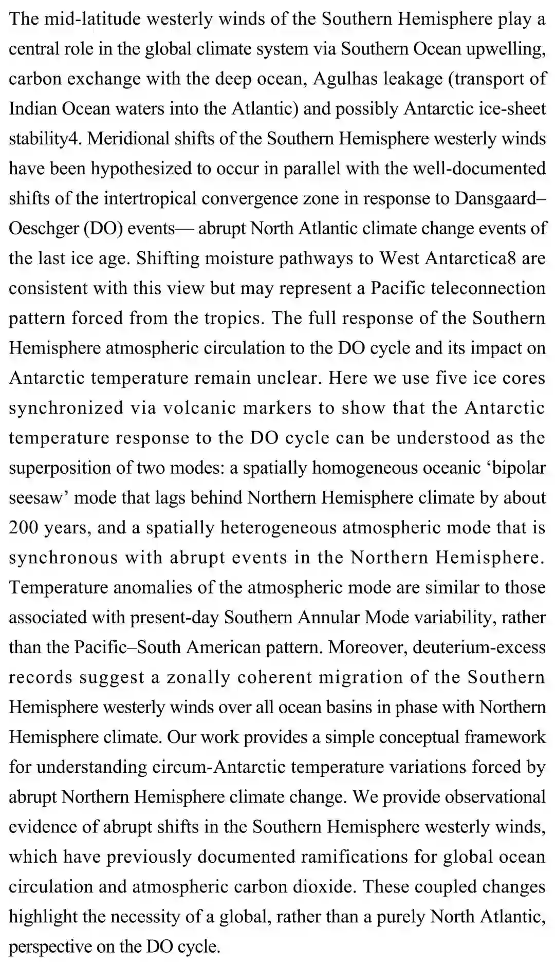 (导读朱姚镓)南半球西风通过影响南大洋上升流、深海碳交换、厄加勒斯流、南极冰盖的稳定度等对全球气候产生重要作用。本研究运用冰芯数据表明北半球的丹斯果-奥什格尔事件(DO)不仅影响南半球西风及南极温度,且对全球海洋环流、南大洋上升流及生产力和大气二氧化碳含量等均有影响。故而在分析DO循环时应从全球尺度而不仅局限在北大西洋。