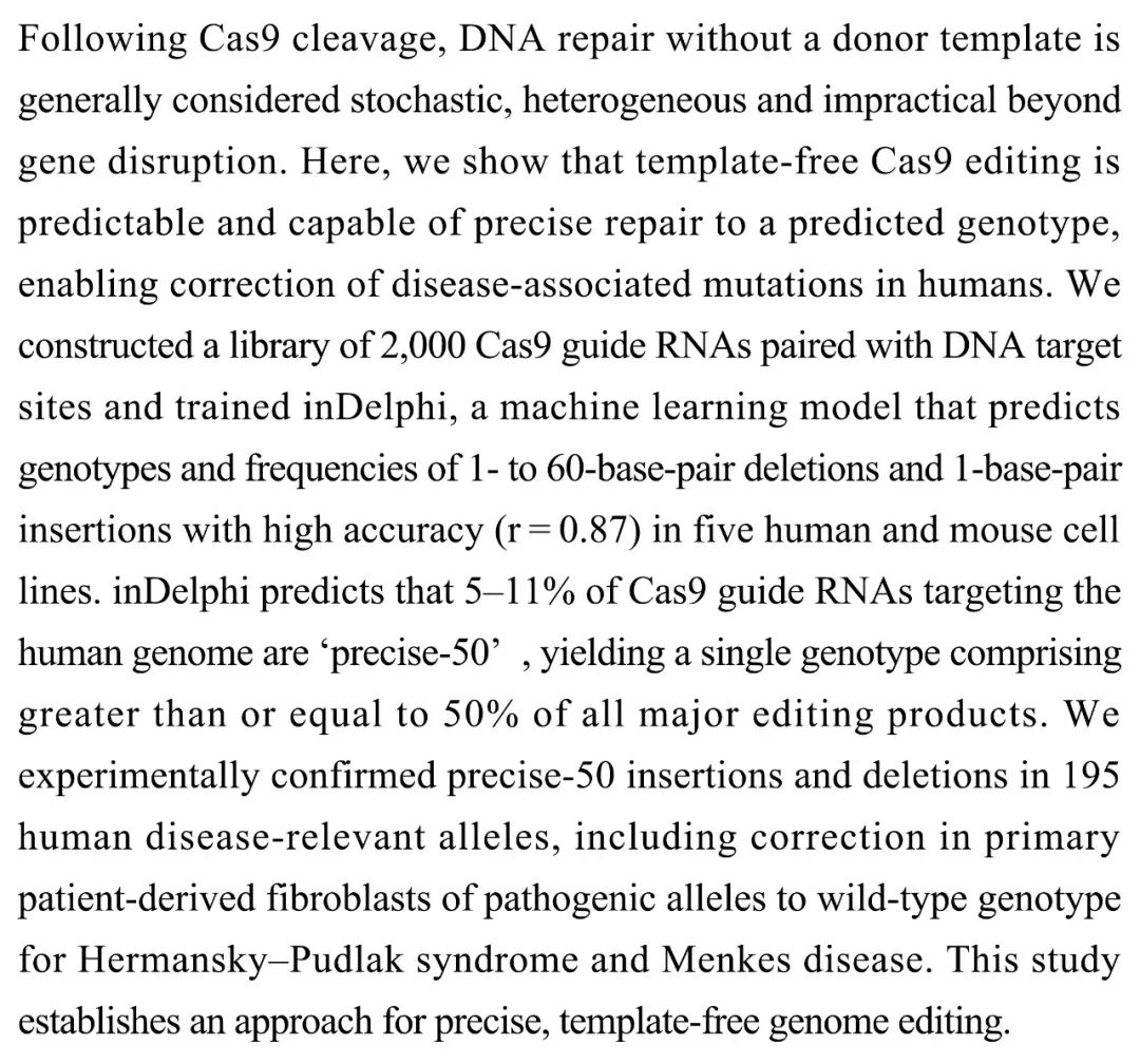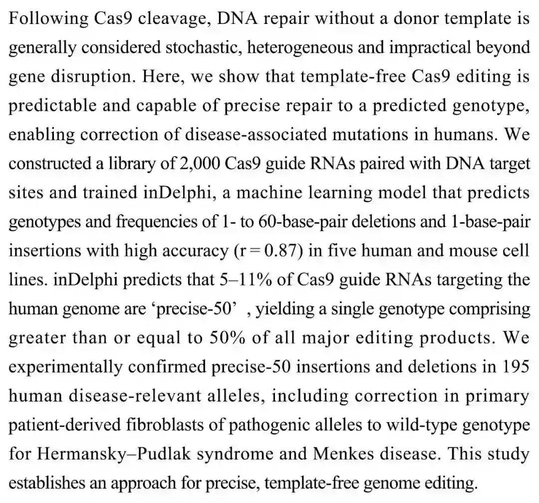 (导读郭思瑶)Cas9蛋白切割DNA后,无模板条件下的DNA修复结果难以预测。科学家以数据库训练inDelphi机器学习模型以预测修复结果,发现在5-11%的修复过程中,某一种特定基因编辑和修复结果会在总结果中的占比超过50%。研究者在195个人类疾病相关的等位基因突变位点上验证了预测的结果,说明该方法可用来精准校正人体内疾病相关的基因突变。