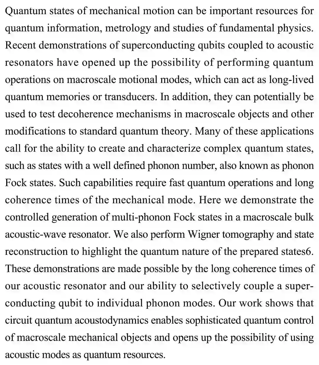 (导读 阿金)近期超导量子比特和声共振器的耦合打开了宏观尺度动态模式上进行量子操作的可能性。本研究展示了多声子福克态在宏观尺度大型声波谐振器中的受控产生,并进行了维格纳斯断层扫描和状态重建,呈现制备态的量子性质。从而开辟了将声学模式作为量子资源的可能性。