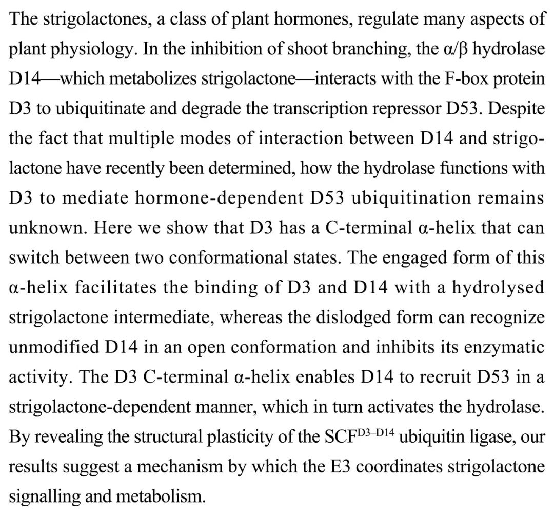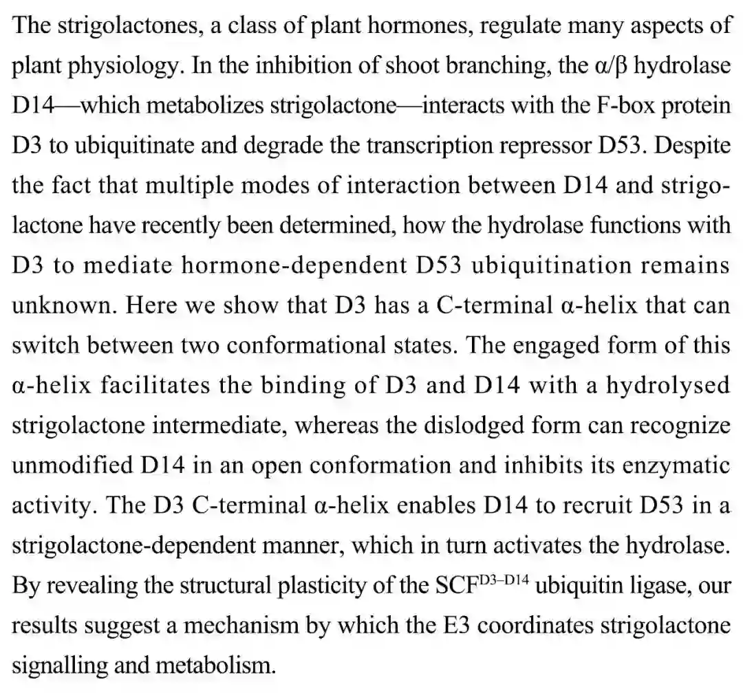 (导读郑楠楠)独脚金内酯是近几年发现的一种植物激素。α/β D14水解酶参与独脚金内酯信号传导,该过程中,D14通过代谢独脚金内酯,与F-box蛋白D3相互作用,进而泛素化并降解转录抑制因子D53。本研究揭示了该过程的结构基础:D3的C末端α螺旋结构可在两种构型之间转化,使D3可以以独脚金内酯依赖的方式,促进D14招募D53,并激活D14的水解酶功能以水解D53。