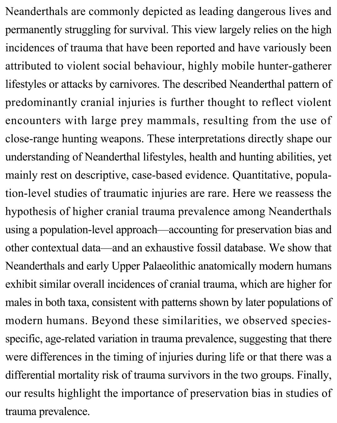 【Paleoanthropology-古人类】Similar cranial trauma prevalence among Neanderthals and Upper Palaeolithic modern humans