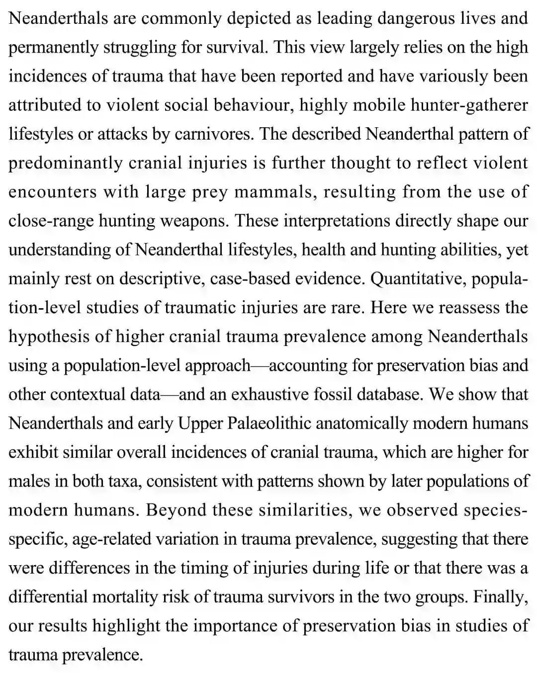 (导读阿金)有研究报告因为暴力社会行为、高度流动的狩猎-采集生活方式等,尼安德特人具有较高创伤发生率。本研究利用种群尺度方法和大量化石数据重新评估了尼安德特人颅外伤发生率,分析表明尼安德特人和旧石器时代晚期的现代人类颅外伤总体发生率相似,且都在男性人群中更高,但年龄分布不同。结果强调了在外伤研究中保留偏倚的重要性。