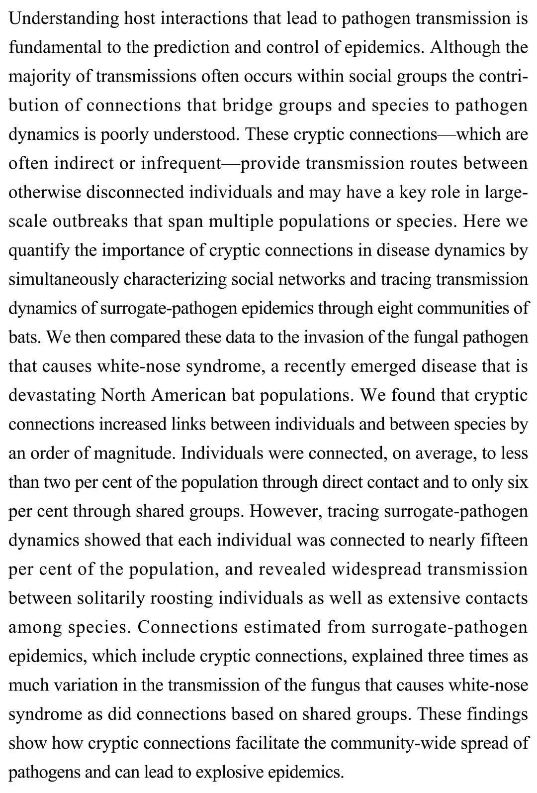 (导读 阿金)理解导致病原体传播的宿主间相互作用是预防和控制流行病的基础,但群体和物种与病原体动态学之间的联系却尚不清楚。本研究透过同时表征社群网络,在八个蝙蝠群落追踪病原体替代性流行病的动态传播,量化了间接不频发的隐藏连接对疾病传播的重要性,并揭示了隐藏连接促进群落内病原体传播的机制。