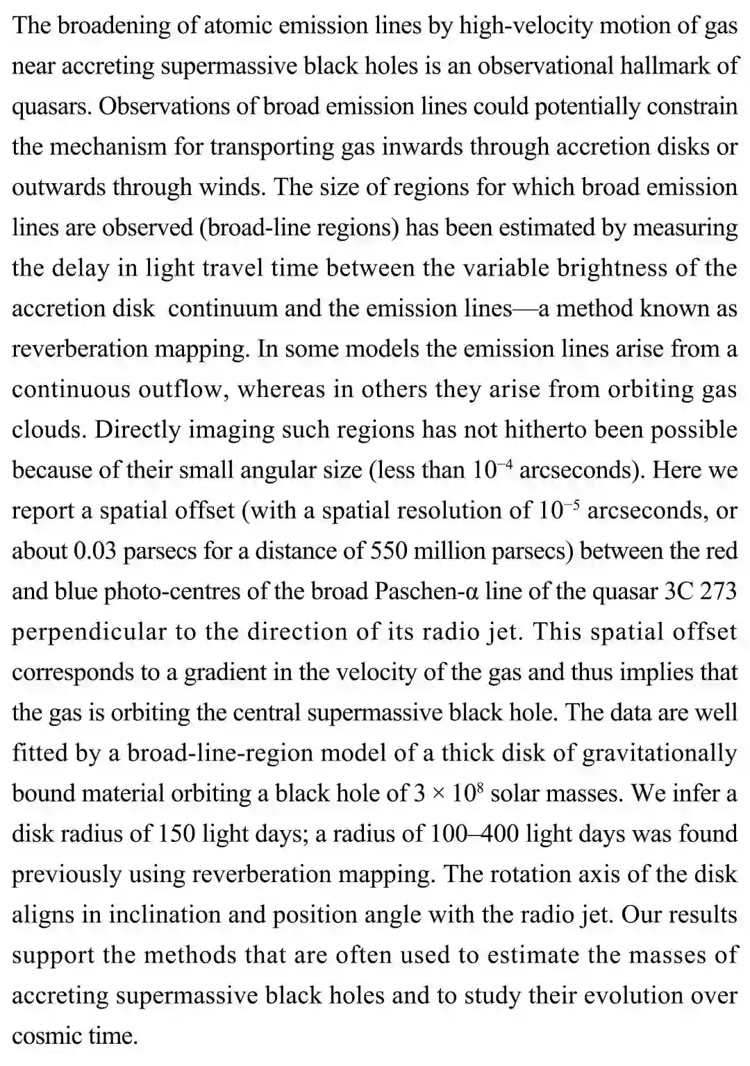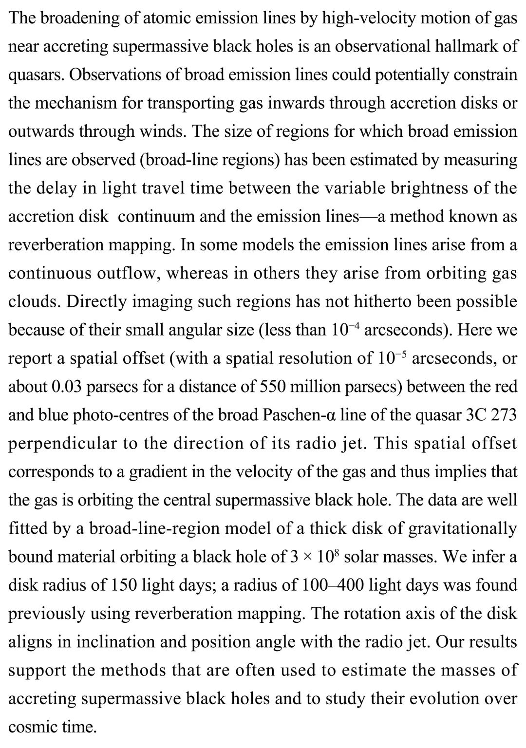 (导读 阿金)超大质量黑洞附近的气体高速运动使原子发射线变宽,是类星体的一个观察标志。其观测可能会限制通过吸积盘向内输送气体或向外通过风输送气体的机制。本研究报告类星体3C 273垂直于其无线电喷射方向的帕申-α宽线的红蓝光中心的空间偏移,该偏移符合气体的速度梯度,暗示气体绕着超大质量黑洞中心旋转。该结果为研究黑洞的演化史提供有效方法。