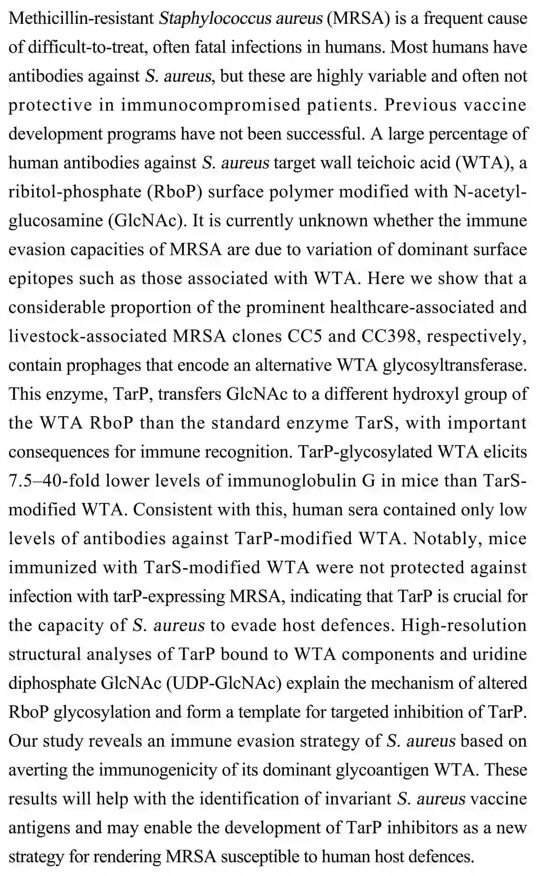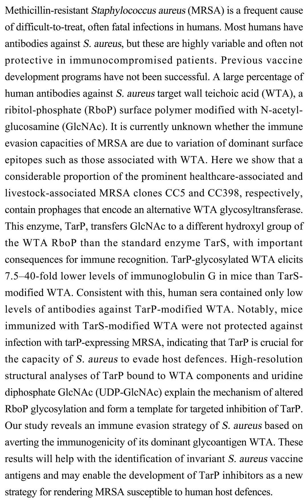 (导读 陈欣桐)耐甲氧西林金黄色葡萄球菌(MRSA)是一种能引起严重感染的病原菌,且其免疫逃逸机制仍不明。本文对比了含有由前噬菌体编码的标准壁磷壁酸(WTA)糖基转移酶TarS或另一种糖基转移酶(TarP)的MRSA CC5和CC398菌株。经TarS修饰的WTA免疫小鼠不能抵御表达TarP的MRSA感染,表示TarP对MRSA的免疫逃逸能力具重要意义。研究结果有助于鉴定MRSA的疫苗固定抗原,并开发TarP抑制剂使成为MRSA免疫易感菌的新策略。