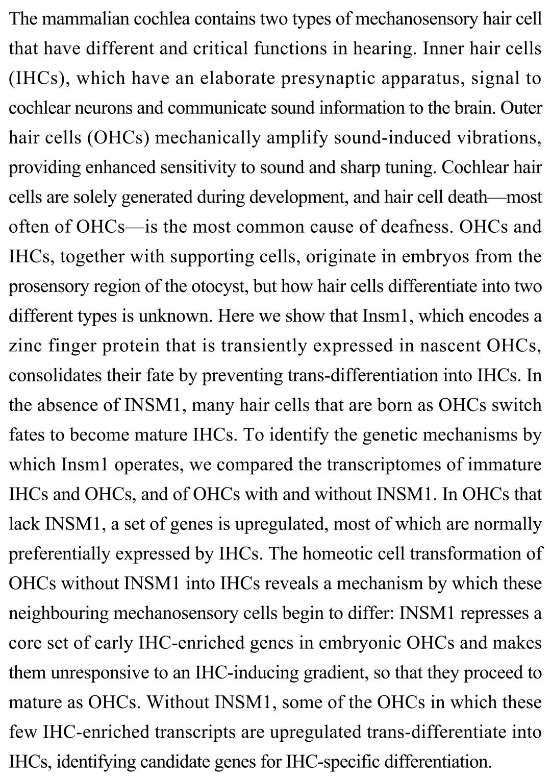 Trans-differentiation of outer hair cells into inner hair cells in the absence of INSM1