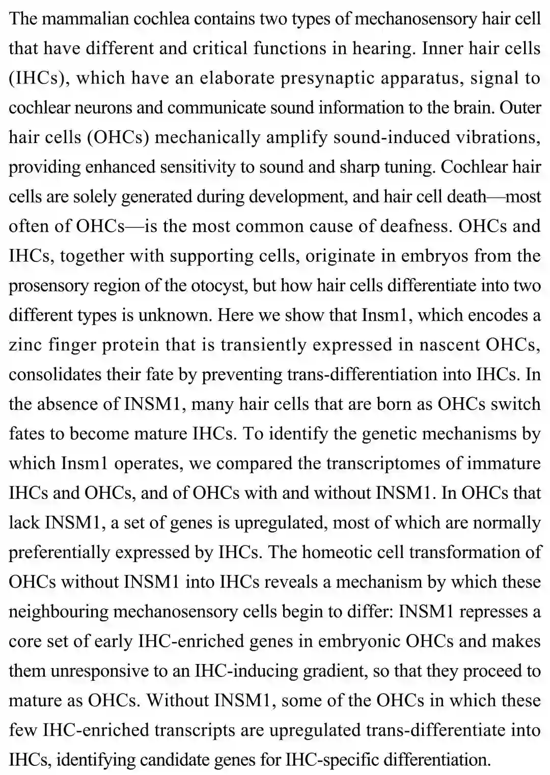 (导读 阿金)哺乳动物耳蜗拥有两种在听觉上不同重要功能的应力感受细胞:内毛细胞(IHCs)和外毛细胞(OHCs),但两种亚型的分化机制尚不清楚。本研究发现编码锌指蛋白质并在原始OHCs中瞬时表达的Insm1通过抑制其转分化成IHCs而巩固OHC状态。在INSM1缺失情况下,OHCs中一组倾向在IHCs中表达的基因表达上调,促进胚胎OHCs向IHCs的转分化。