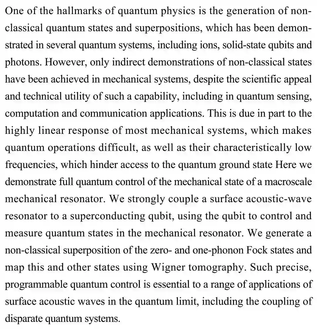 (导读 阿金)量子物理学的标志之一是非经典量子态和叠加的产生,但迄今只在力学系统中实现了非经典态的间接展示。本研究演示了宏观尺度机械谐振器的力学状态的全量子控制。将表面声波谐振器和超导量子比特耦合在一起,利用量子比特控制和测量机械谐振器的量子状态。并生成了零声子和单声子福克态的非经典叠加。这种可编程量子控制对一系列量子极限中的表面声波的应用必不可少。