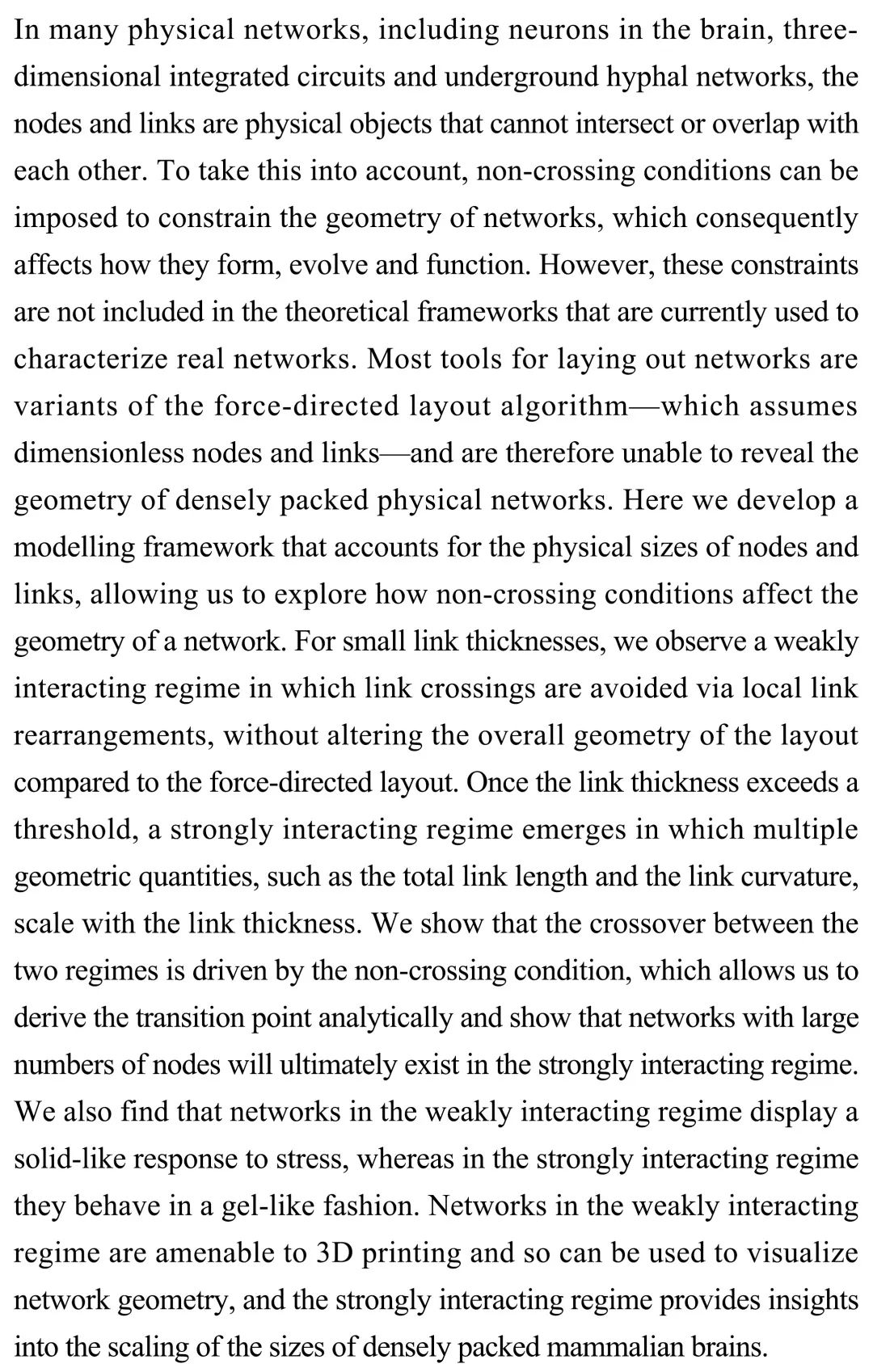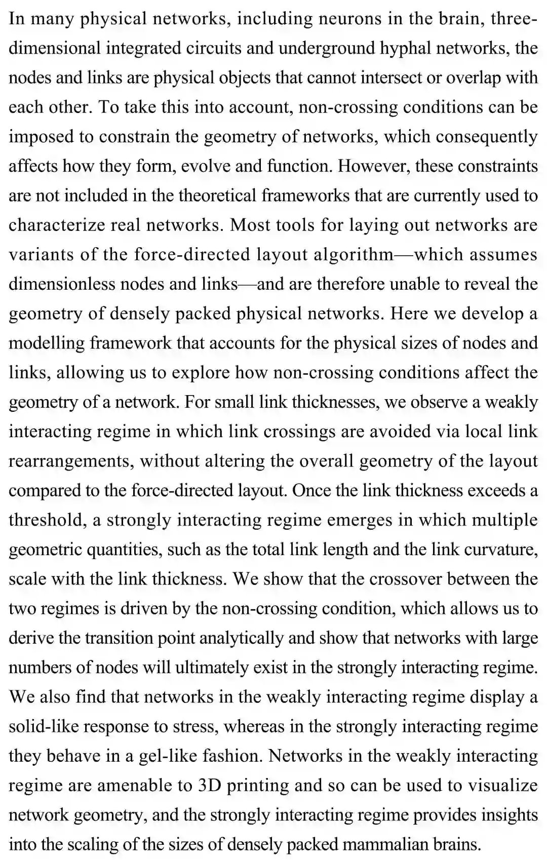 (导读 刘奇)诸多物理中网络节点与链路是不能交叉或重叠的物理对象,当前理论框架通常没有考虑到“不交叉”条件。本文建模了一种能解释节点与链路物理大小的框架,来探究此约束影响网络几何结构的机制。不交叉约束作用于强弱相互作用间的过渡段,大量结点的网络最终会转变到强相互作用,其能深入探究密集填充的哺乳动物大脑尺度缩放的机理。
