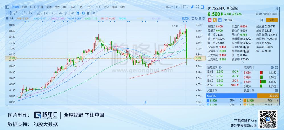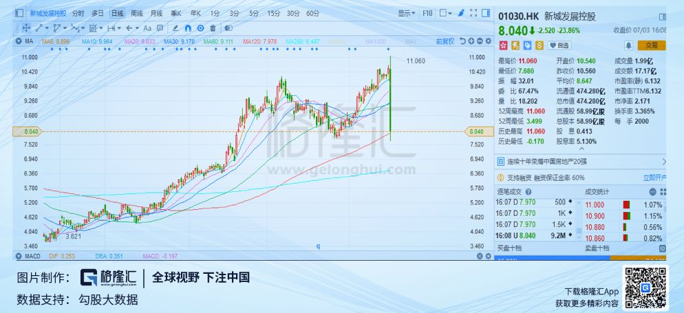 受此消息影响,港股新城发展控股(1030.HK)股价快速跳水,跌幅24%。而A股的新城控股(601155.SH)因消息爆出已是收盘,股价暂未受到影响,全天涨幅3.79%,明天大概率会被按在跌停板上反复摩擦、摩擦。