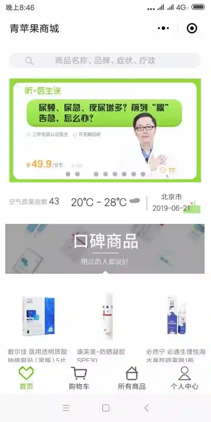 青苹果商城,是青苹果健康平台首推的产品线之一,2017年4月14日正式上线。2017年11月,青苹果健康正式宣布从熟人医患进军到医疗电商。青苹果商城有且仅有微信小程序,以及青苹果健康公众号商品推荐两个入口。上线初期,商城用户定位在有特殊需求的高端人群,商品主打疤克、美皮护等高价非处方药。中后期,商城改变定位,推广中低端产品。
