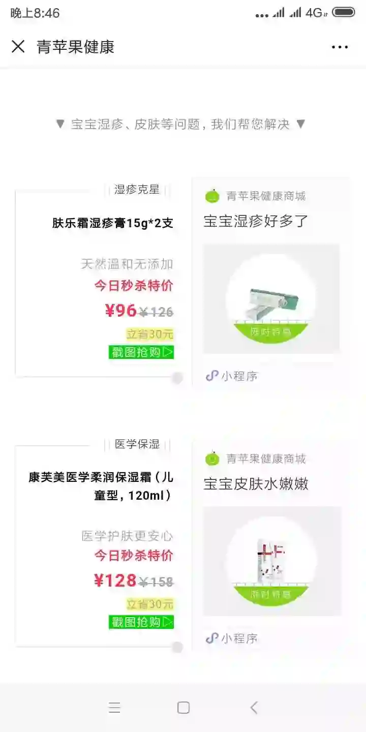 3月18日,青苹果健康公众号更新了最后一篇科普文章《母乳擦脸,真的可以治疗宝宝湿疹?》,由复旦大学附属华山医院皮肤科主任医师吴文育撰写。文章末尾推荐了两款产品,北京京童医药科技有限公司生产的京童肤乐霜15g*2,售价为96元和康芙美医学柔润保湿霜(儿童型)120ml,售价为128元。点击进入,链接到小程序青苹果健康商城,药品依然可以购买。