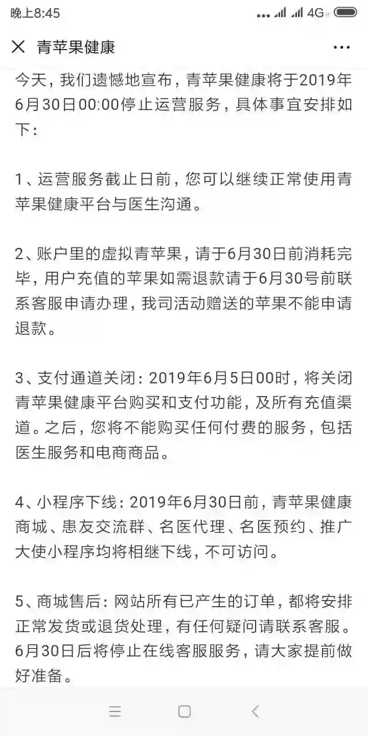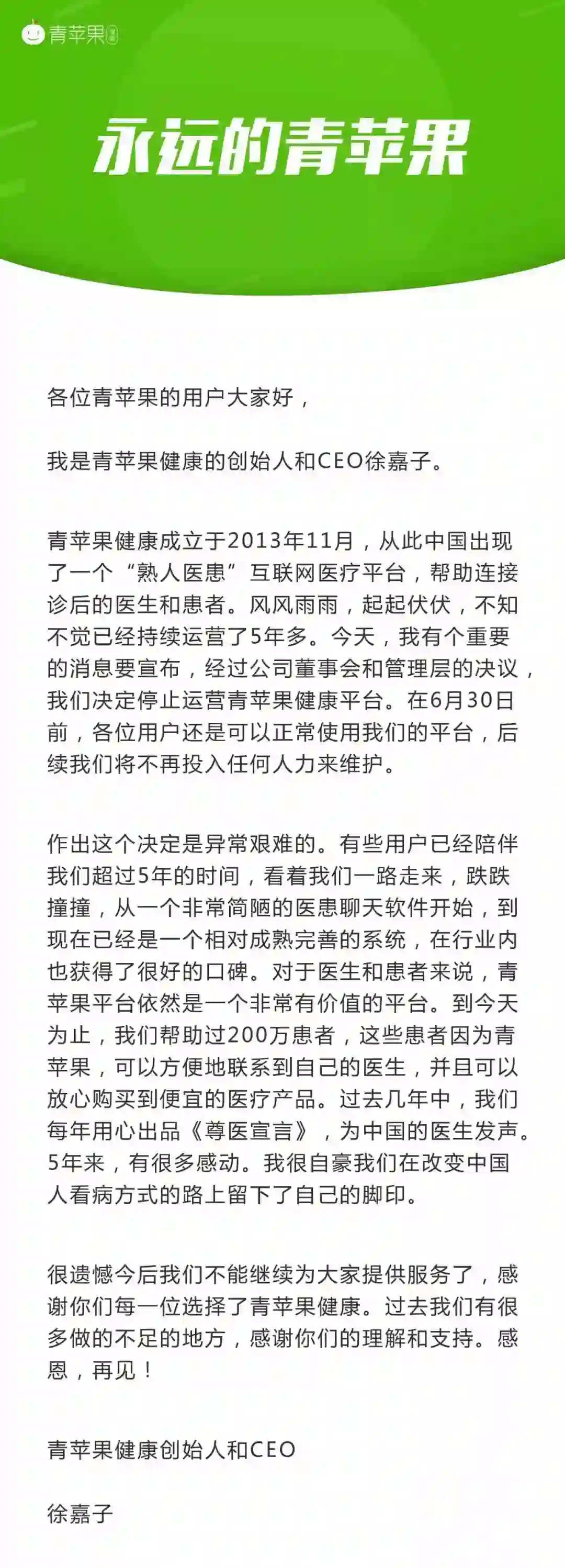 此次更新主要围绕两点,一是,正式宣布青苹果健康6月30日停止运营;二是,青苹果健康创始人兼CEO徐嘉子(本名:徐嘉)发表署名文章《青苹果健康CEO的一封来信》致歉用户。