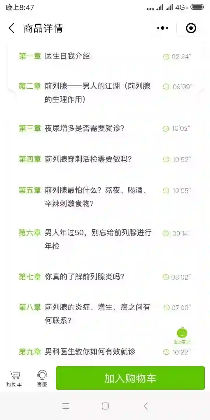 线上付费课程方面,问题则更为严重。青苹果健康的在线付费课程内容以医对患的医学科普为主,根据医生职称不同,售价不同。单节时长5-10分钟,9节课一组打包售卖,价格在19.9-49.9不等。