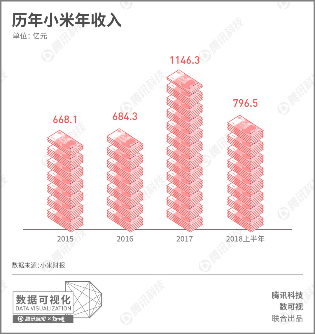 小米的年收入从2016年到2017年实现了暴增,突破了千亿元。得益于销量和平均售价的双提升,小米今年的收入表现很强劲,上半年收入已经达到了796.48亿元。