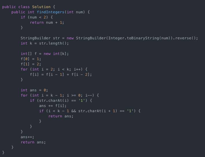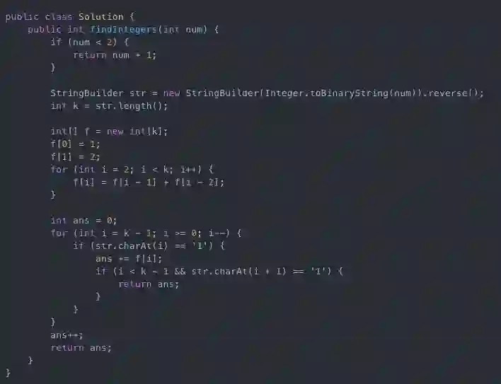 给定一个正整数n,求出0到n中有几个数满足其二进制表示不包含连续的1。1<=n<=10^9。