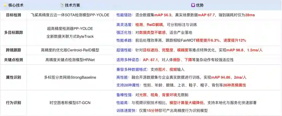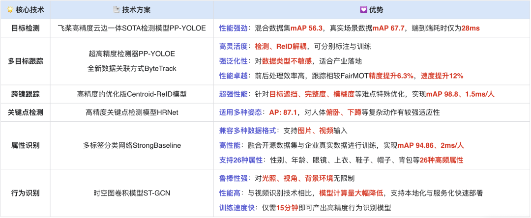 PP-Human支持属性分析、行为识别、流量计数/轨迹留存三大功能,覆盖目标检测、多目标跟踪、属性识别、关键点检测、行为识别和跨镜跟踪六大核心技术: