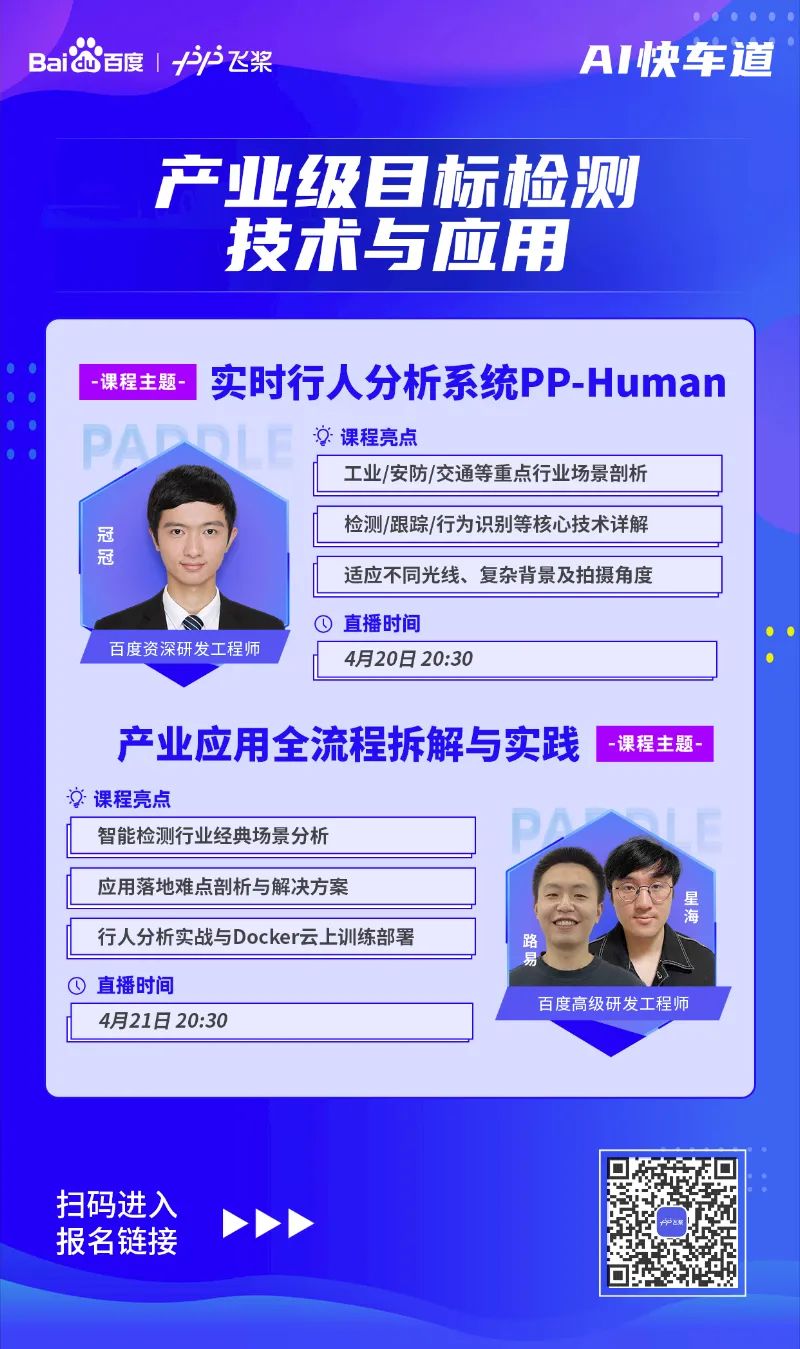 其中,属性分析支持性别、年龄、眼镜、帽子、衣着等26种通用属性,行为识别支持毫秒级摔倒检测,在4月19~21日的三日直播课中,百度资深研发工程师还将在