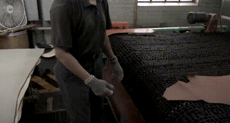 工人们一开始先是把天然橡胶做成的人造革折叠好,做成橄榄形状