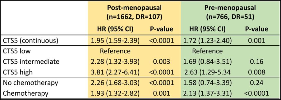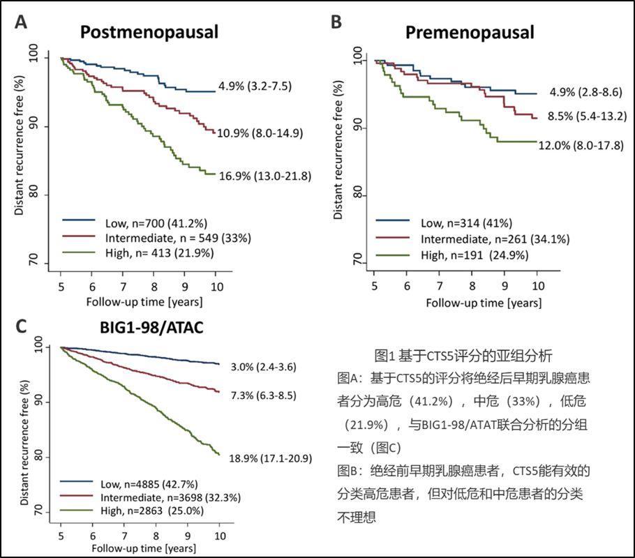 CTS5在大样本的未经筛选的,包括绝经前妇女的非试验患者中证明了其预测远期远处转移的临床有效性。CTS5筛选的低风险人群远期远处转移的风险较低,不能确定内分泌治疗延长至10年。