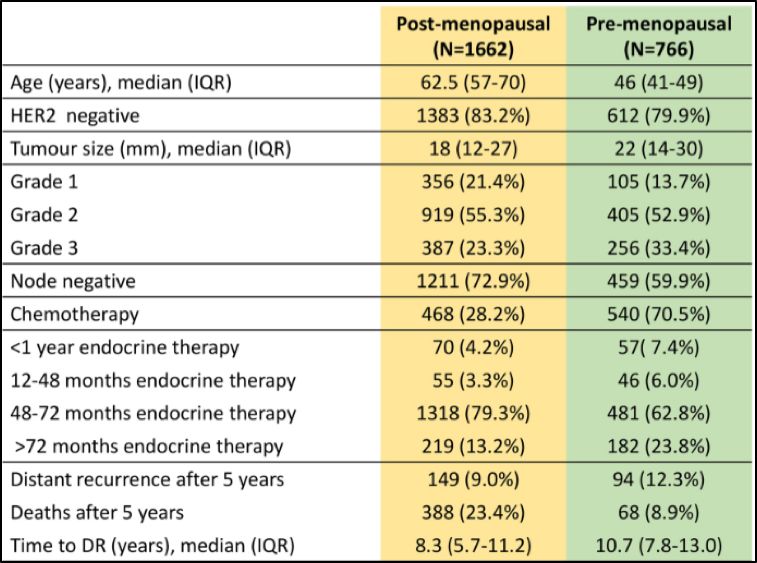 研究共纳入2428名患者,平均随访时间为9.34年(表1)。CTS5对绝经后和绝经前的远期远处转移有显著的预测作用(表2)。绝经后队列的CTS5风险分层与之前的BIG1-98/ATAT训练队列比较。42.1%的绝经后妇女被归为低风险组,远期远处转移风险为4.9%,与中、高危组相比,这些患者远期远处转移风险显著降低(表2)。在绝经前人群中,41%被归为低风险,远期远处转移风险为4.9%(图1)。CTS5对化疗和未化疗患者的预后评估显示化疗(HR=2.26, 95%CI 1.68~3.03)和未化疗(HR=1.93, 95%CI 1.32~2.82),CTS5对绝经后远期远处转移的复发风险与观察结果高度一致(图2) 。