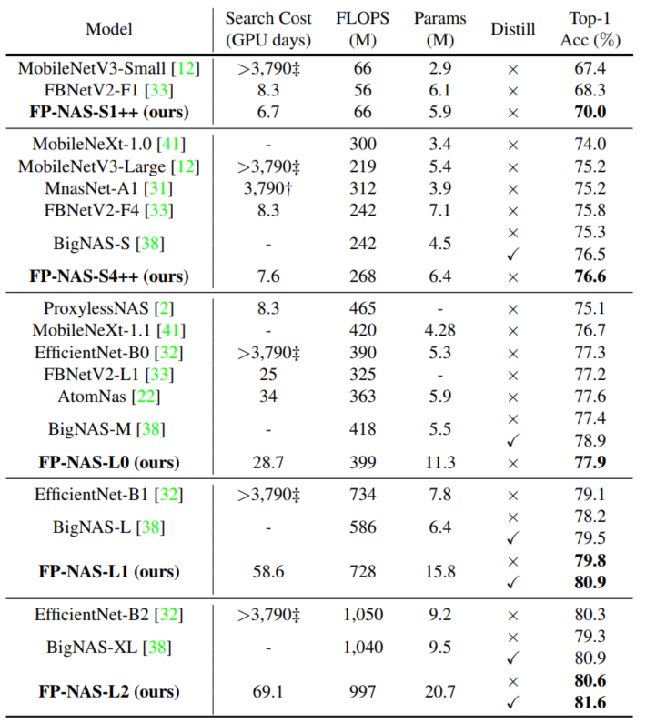FP-NAS与PARSEC相比,它可以减少64%的架构采样,搜索速度提高2.1倍。与FBNet-V2相比,FP-NAS的速度提高了1.9-3.6倍,并且搜索的模型优于ImageNet上的FBNet-V2模型。FP-NAS允许将FBNet-V2空间扩展至更宽(即更大的通道选择)和更深(即更多的块),同时添加Split-Attention Block并启用对拆分数目的搜索。搜索大小为0.4G FLOPS的模型时,FP-NAS比EfficientNet快132倍,并且搜索到的FP-NAS-L0模型比EfficientNet-B0精确度高0.6%。在不使用任何架构替代或扩展技巧的情况下直接搜索高达1.0G FLOPS的大型模型。同时FP-NAS-L2模型具有简单的蒸馏功能,比BigNAS-XL的蒸馏性能高出0.7%,而FLOPS却更少。